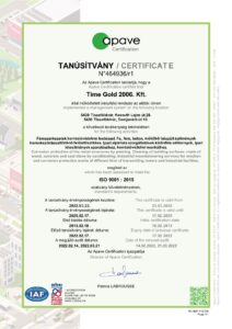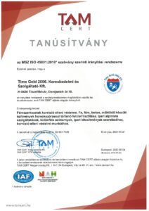Társaságunk EN ISO 9001:2015 szabvány szerinti minőségirányítási rendszerrel és MSZ ISO 45001:2018 szabvány szerinti munkahelyi egészségvédelem és biztonság irányítási rendszerrel rendelkezik.